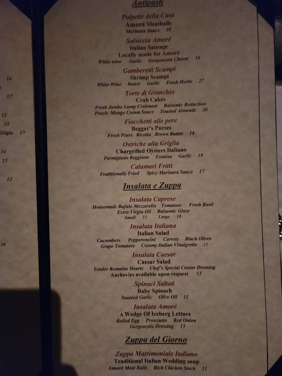 Amore delights guests with an extensive menu that exemplifies the best of Italian culinary traditions. Start your meal with the Insalata Italiana, a vibrant blend of fresh cucumbers, tangy pepperoncini, and creamy Italian vinaigrette that sets the stage for what's to come. For those who are fans of hearty flavors, the Pollo alla Vodka features sautéed chicken simmered in a rich and silky sauce, tantalizing the palate with every bite. If you’re in the mood for something indulgent, look no further than the Costoletta Brasate—braised short rib served with creamy risotto and savory mushrooms that transforms your dining to a sumptuous celebration.